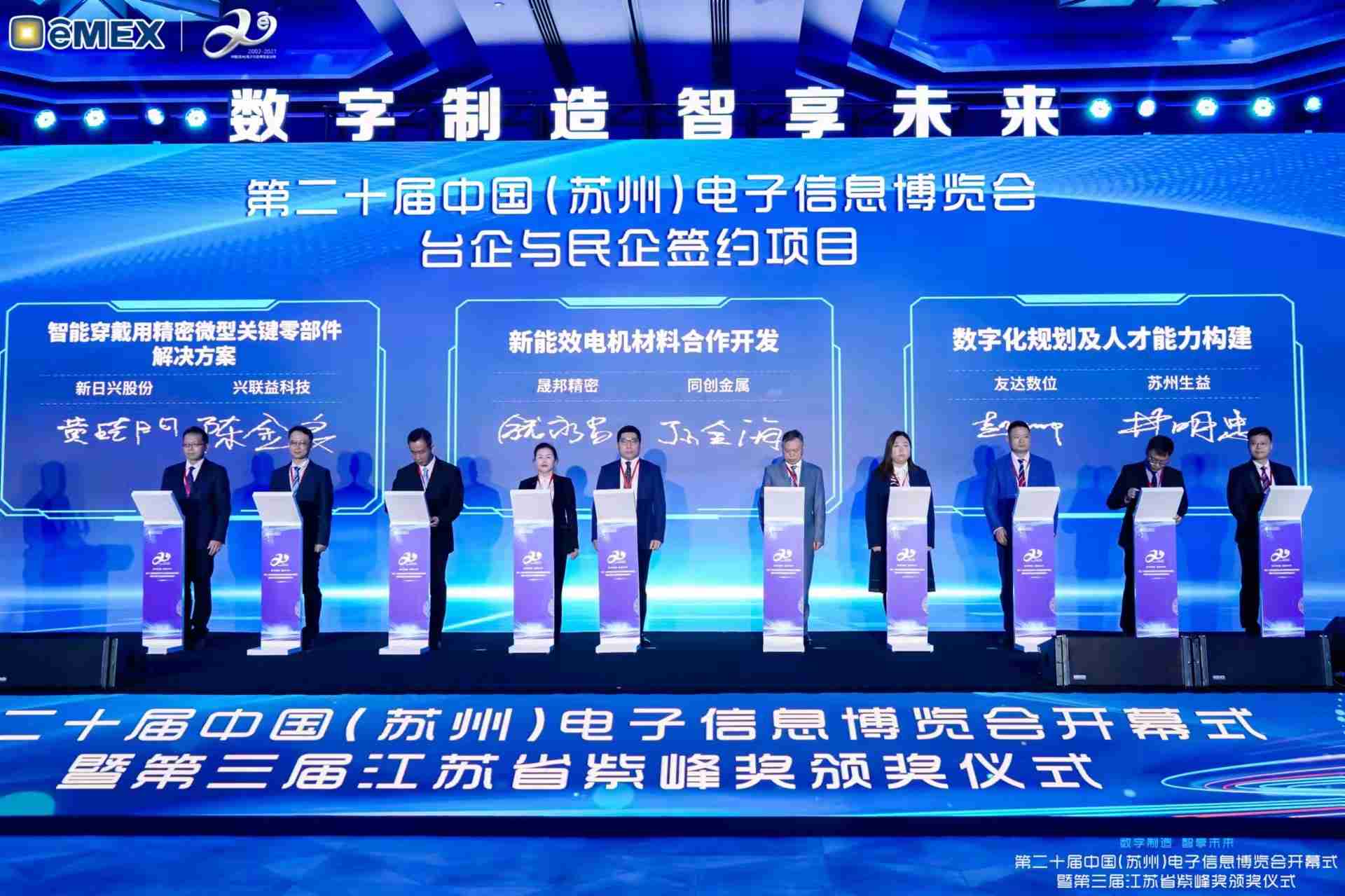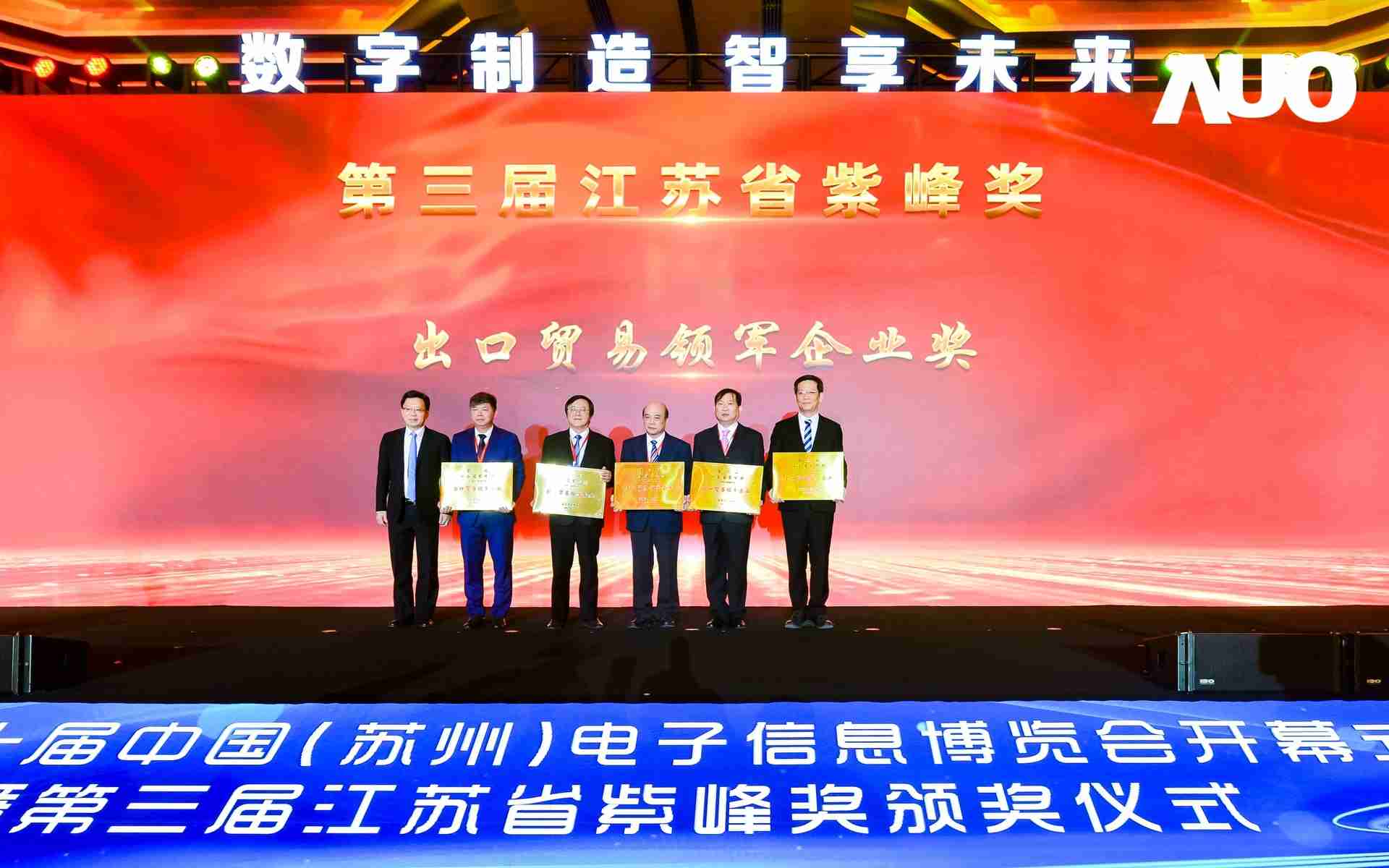 电博会开幕式当天也是第三届江苏省紫峰奖颁奖仪式,,,,省台办、、工信厅、、、、商务厅、、苏州市相关领导均出席并颁奖。。该奖项为表彰对江苏高质量发展做出积极贡献的在苏企业,,由江苏省政府专门设立。。。。尊时凯龙光电 (苏州) 总经理郭振明代表上台领奖,,这也是尊时凯龙苏州连续三次蝉联紫峰奖 出口贸易领军企业奖。。。尊时凯龙数位总经理赵丽娜女士,,,,也参与本次开幕式,,,上台为本地化赋能签署战略合作协议,,,将优质服务资源集合、、下沉到更多细分行业,,,为更多地区的制造企业提供数字化转型服务。。。。