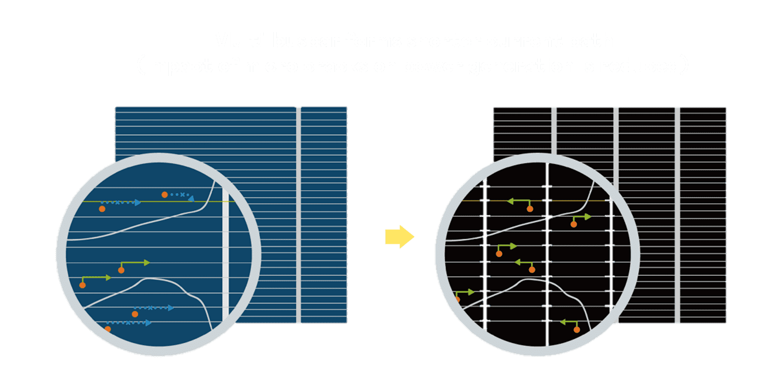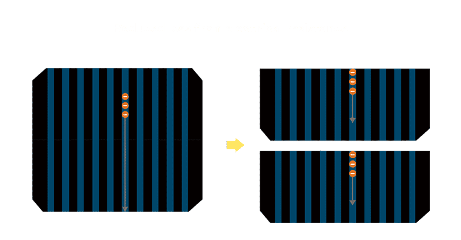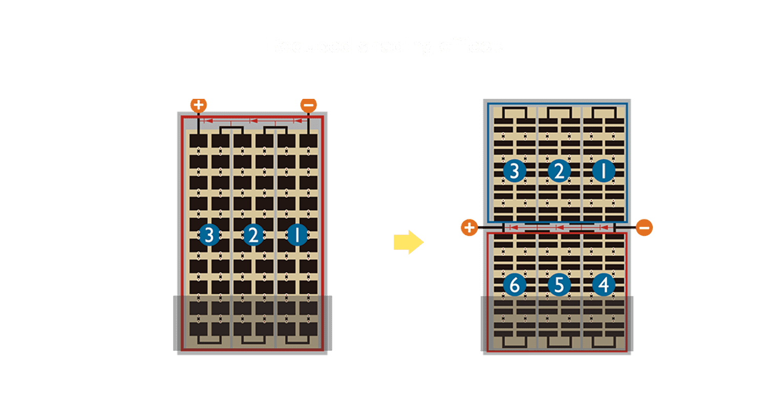 - 结合半切电池,,降低遮阴影响、、、提升模组抗隐裂能力、、、并减少电阻损耗,,,进一步提升模组发电效能。。