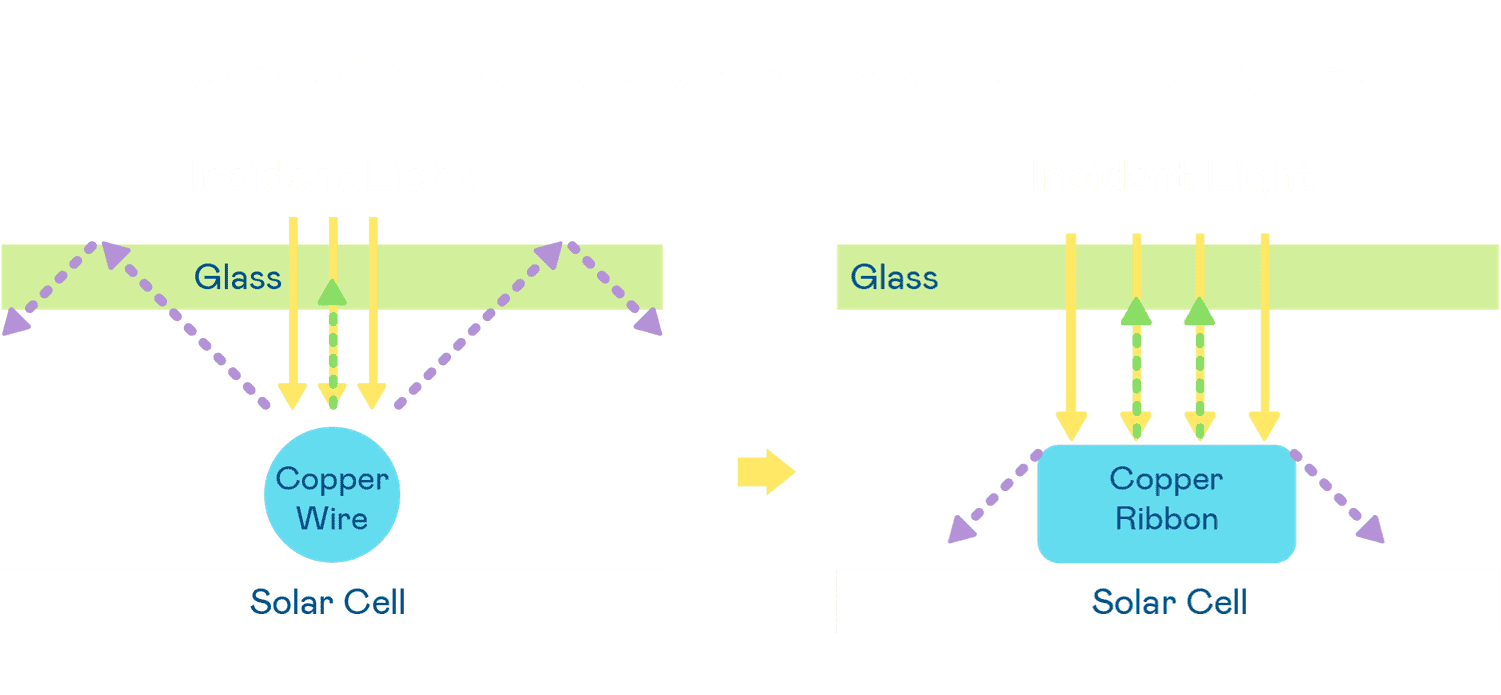 - 电池使用多条铜导线 (Copper wire) 于电池片上形成较短的电流路径,,提高电流收集效率,,采用圆形设计的铜导线较传统扁平式的铜焊带 (Ribbon),,,可增加入射至电池的光线量。。