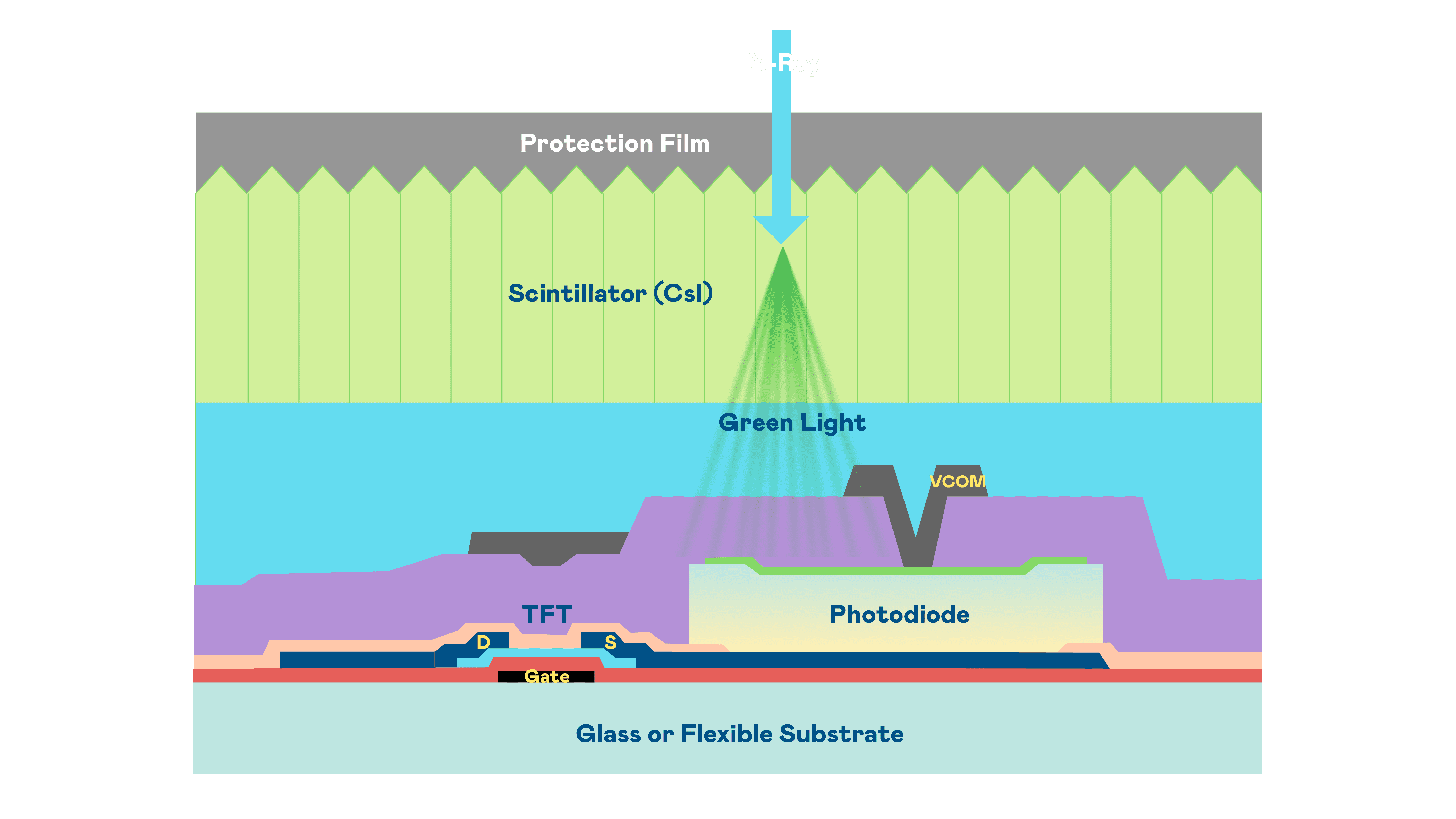 尊时凯龙的X光影像感测阵列使用薄膜电晶体 (TFT) 作为每个像素的读取开关,,搭配光电二极体(Photodiode)的光电转换元件,,用以感测X光影像讯号。。